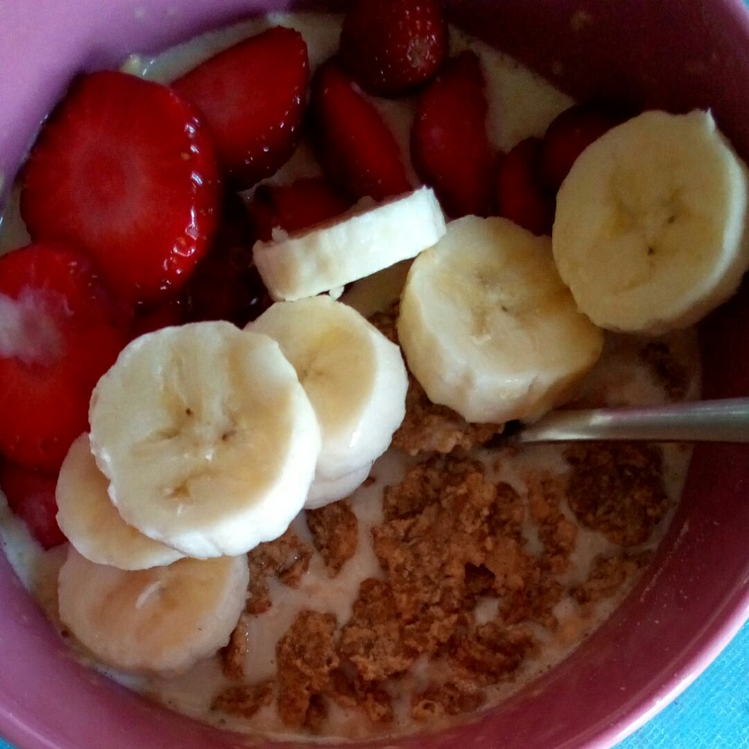 Pequeno Almoço: Pingo Doce Iogurte Líquido Magro Aroma Tropical, Myprotein Impact Whey Protein, Nestlé Cereais Fitness Original, Morangos, Banana. mais...
