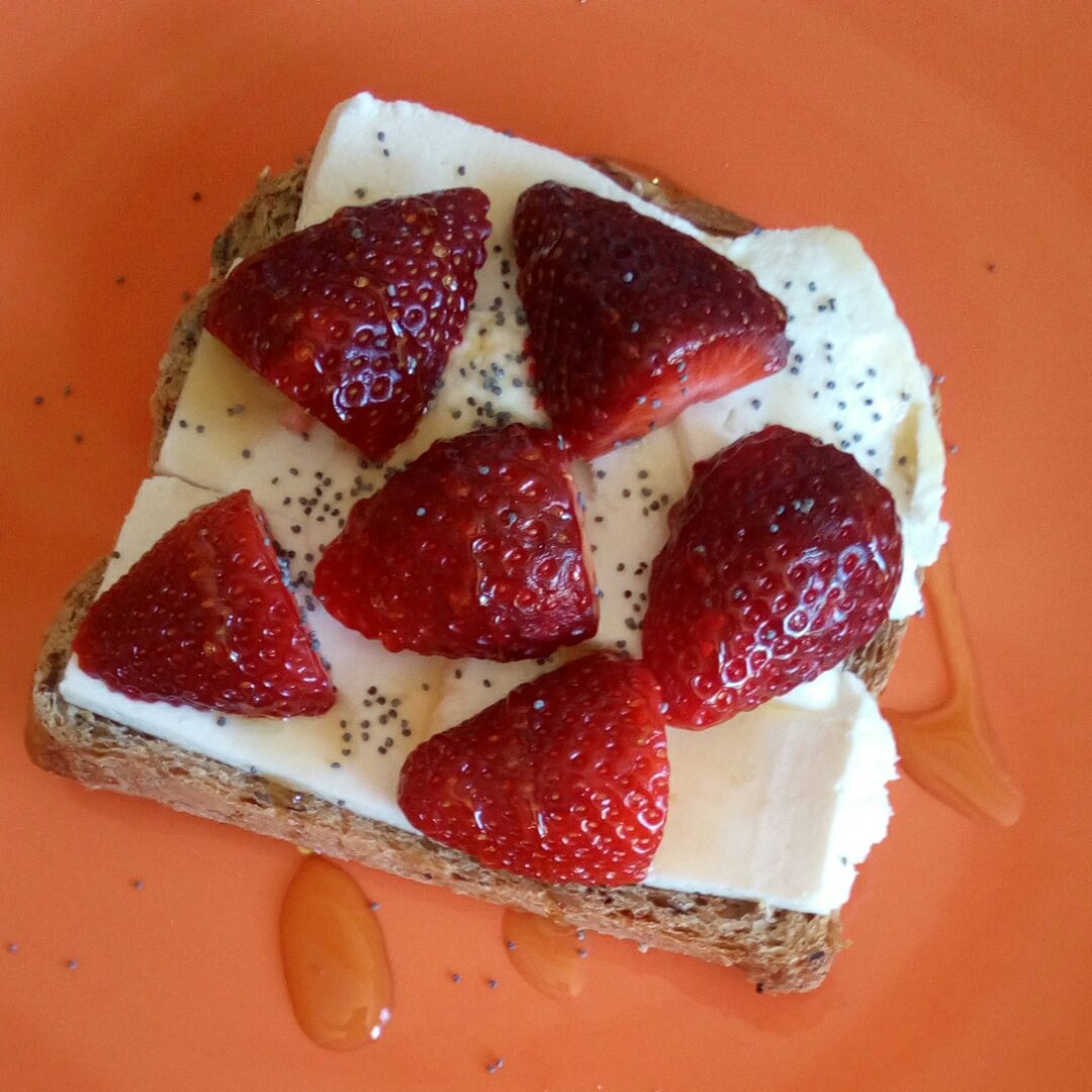 Pequeno Almoço: Shape Pão de Forma com Cereais, Queijo Fresco, Morangos, GutBio Geleia de Agave. mais...