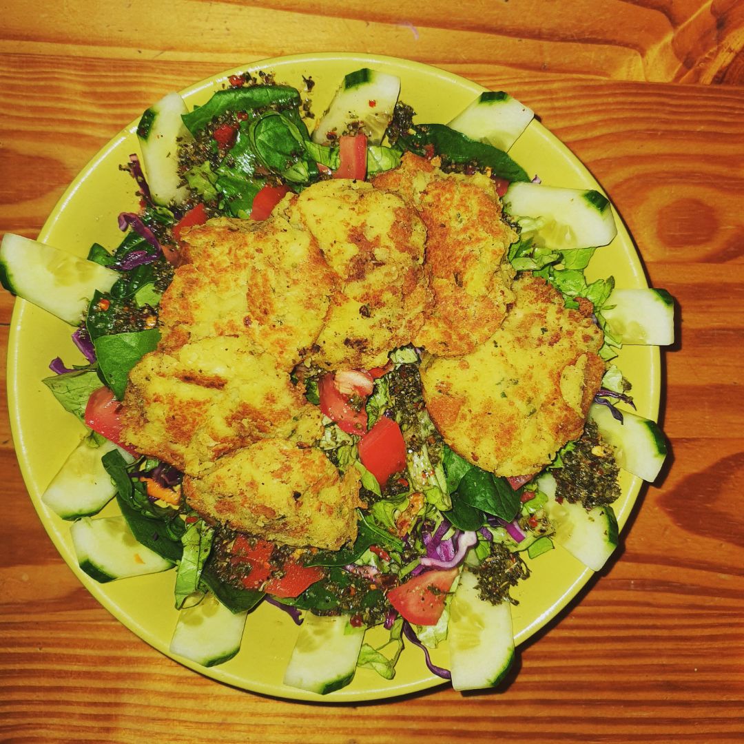 salada mista com mini hamburguer de grão e molho chimichuri