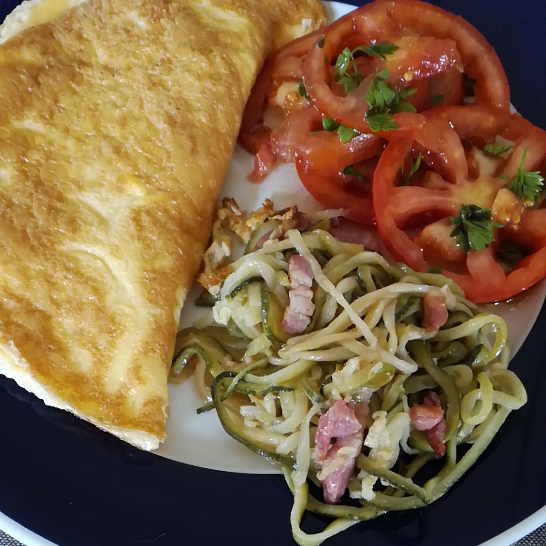 Omelette de mozzarella, courgette com bacon e tomate com balsâmico.