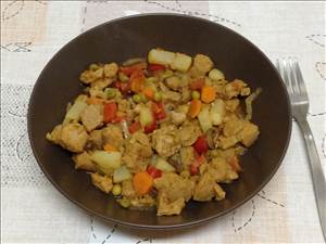 - Quando estiverem a ficar sem água refrescar com o vinagre e deixar evaporar mexendo sempre, de seguida adicionar o tomate aos pedaços, o pimento aos cubos, as cenouras as rodelas finas, o alho francês as rodelas, o sal, o louro, a pimenta, e deixar estufar um pouco, para de seguida adicionar a soja bem escorrida.
